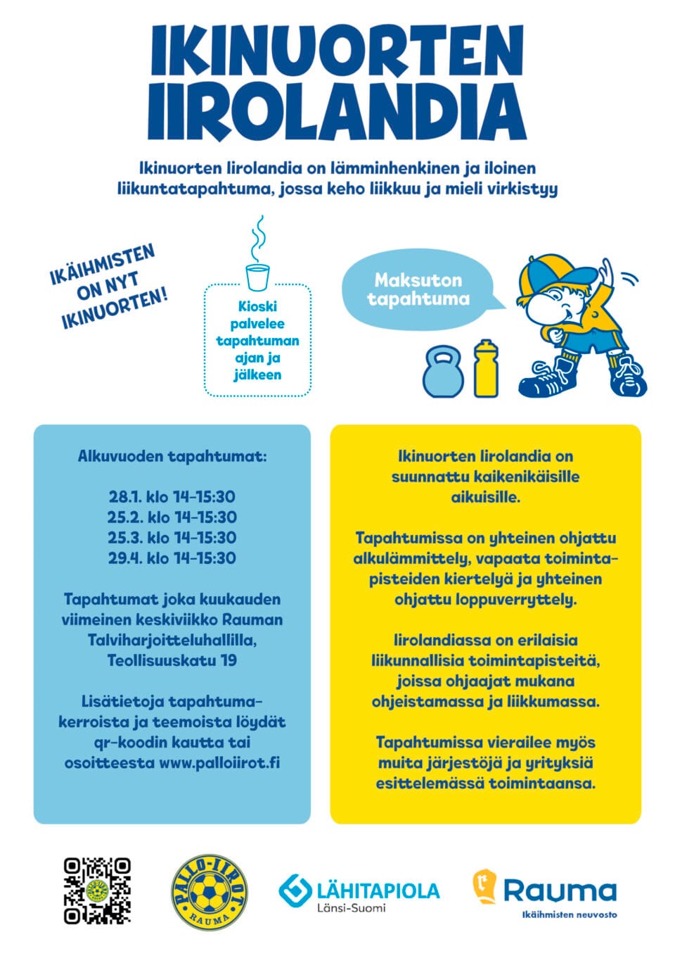 Ikinuorten Iirolandiatapahtumat alla esitteessä. Tapahtumat aina kuukauden viimeisenä keskiviikkona klo 14-15.30 Rauman talviharjoitteluhallilla., Teollisuuskatu 19