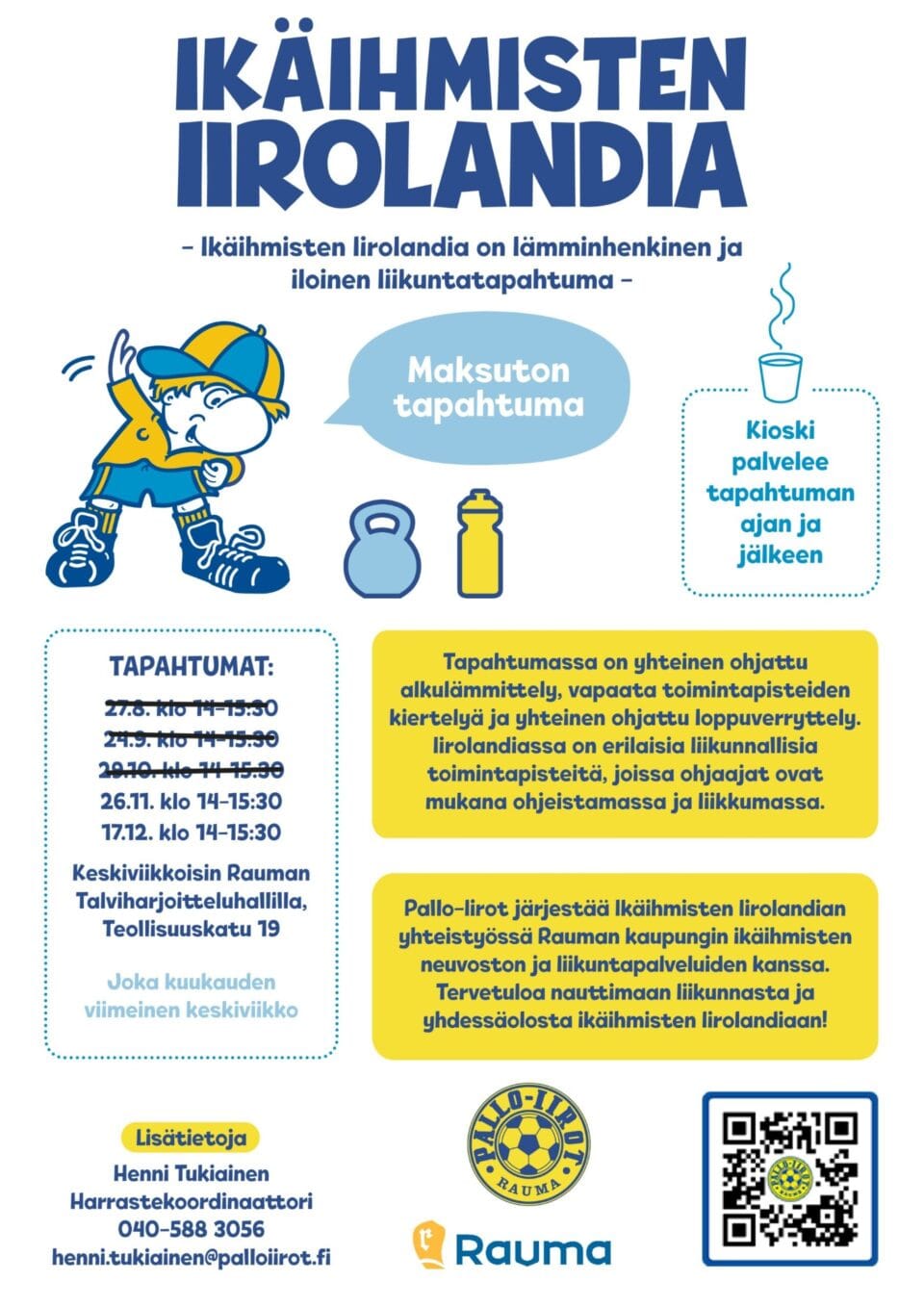 Ikäihmisten Iirolandiassa järjestetään kuntotestauksia halukkaille keskiviikkona 26.11. klo 14-15:30 Talviharjoitteluhallilla.
